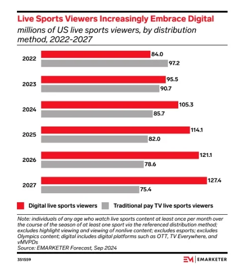 105.3M Americans will watch live sports via digital this year, up from 95.5M last year, thanks to new sports deals and offerings from streamers. (eMarketer)