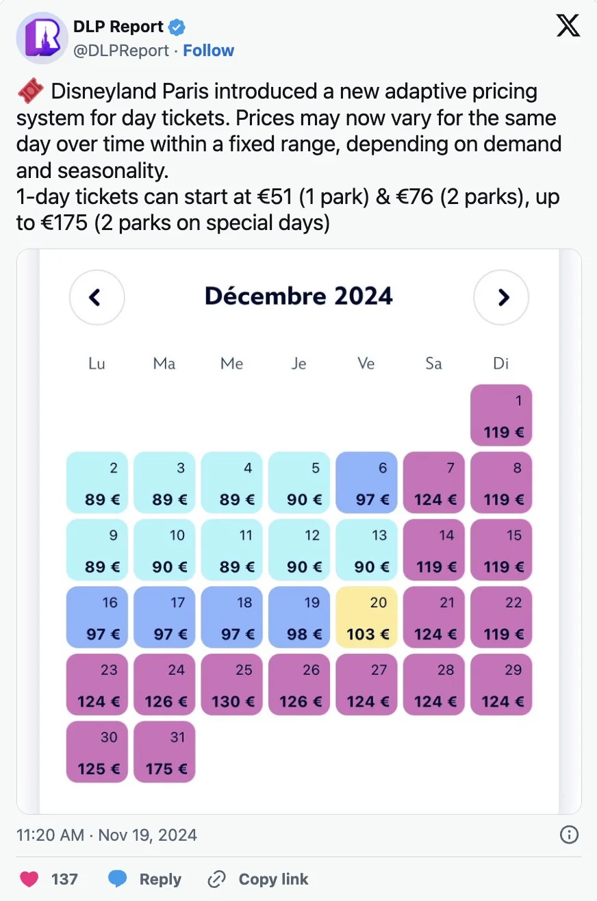 Disneyland Paris has introduced a new dynamic pricing system for dated tickets, where prices fluctuate based on demand and seasonality. (WDWNT)