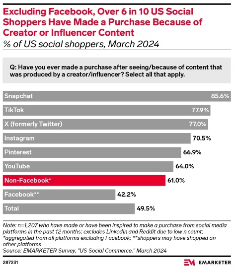 Snapchat is the leading platform for creator-driven shopping, especially among US Gen Z consumers, with 85.6% of social shoppers influenced by creator content. (Emarketer)