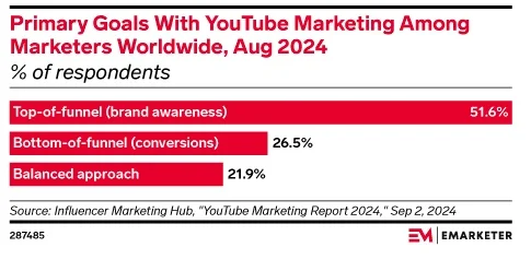 The majority of marketers worldwide primarily use YouTube to drive brand awareness rather than conversions, demonstrating its effectiveness in top-of-funnel marketing strategies. (Emarketer)