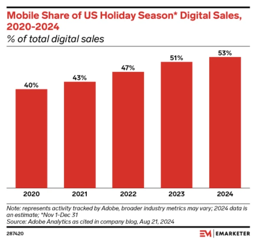 Mobile devices account for 53% of U.S. holiday season digital sales in 2024, marking the second consecutive year they've dominated holiday ecommerce, according to Adobe Analytics. (Emarketer)