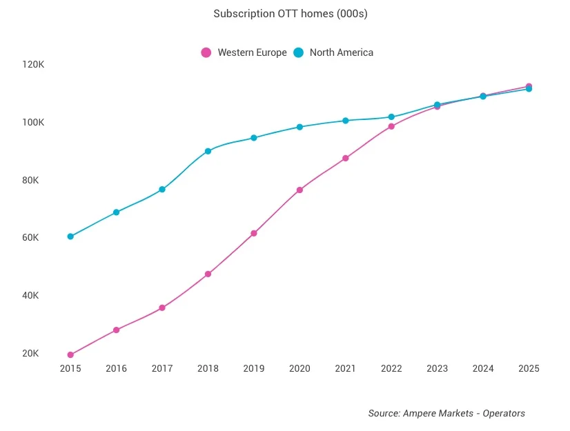 The number of homes with at least one streaming subscription in Western Europe is set to surpass North America next year, with the UK and Germany driving much of the growth. (Ampere)