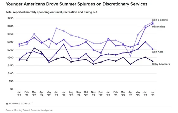 US Millennials and Gen Zers have been primarily responsible for driving discretionary services spending growth in recent months and could be responsible for a drop in the fall. (Morning Consult)