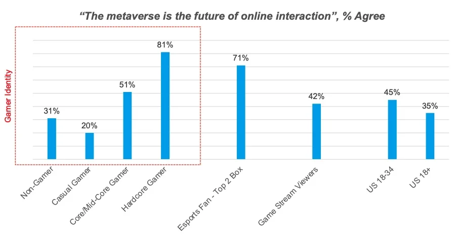 81% of hardcore gamers in the US believe the metaverse is the future of online interaction compared to 31% of non-gamers. (YouGov)