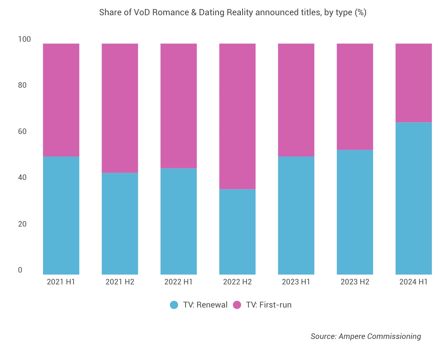 VoD services have significantly reduced new Romance titles, with a 71% drop from H1 2022 to H1 2024, preferring to localize successful shows like "Love is Blind" in various markets. (Ampere Analysis)