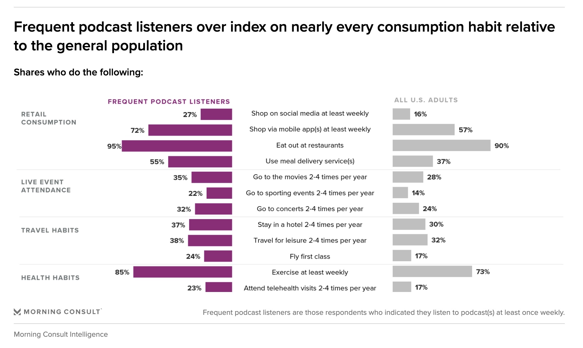 Frequent podcast listeners in the US are more likely to shop, attend live events and travel for leisure compared to all US adults. (Morning Consult)