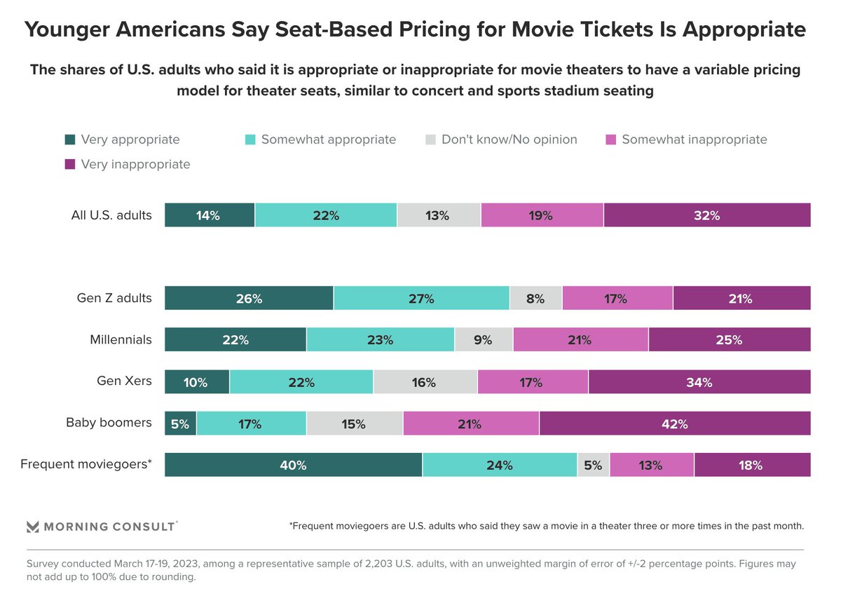 About half of Americans (51%) believe it's inappropriate for movie theaters to have a variable pricing model for theater seats, compared with 36% who say it’s appropriate. (Morning Consult)