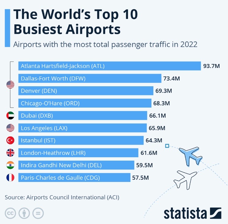 Hartsfield-Jackson Atlanta International Airport was the world's busiest airport in 2022 with 93.7M passengers. (Statista)