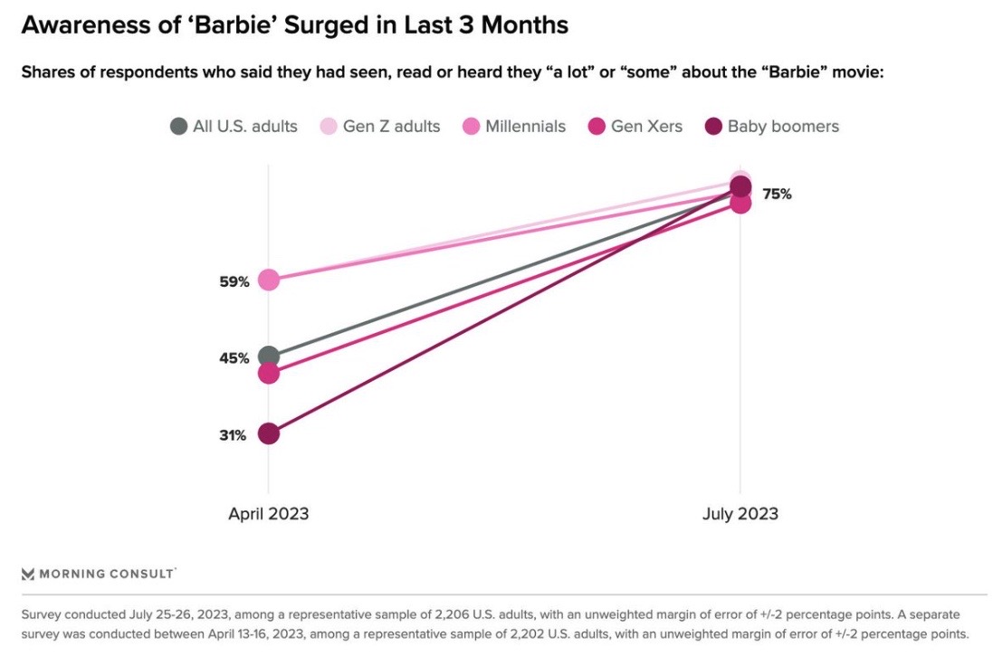Awareness of “Barbie” skyrocketed in the three months leading up to its release, as the share of Americans who had seen, read or heard something about the movie jumped from 45% in April to 75% in late July. (Morning Consult)
