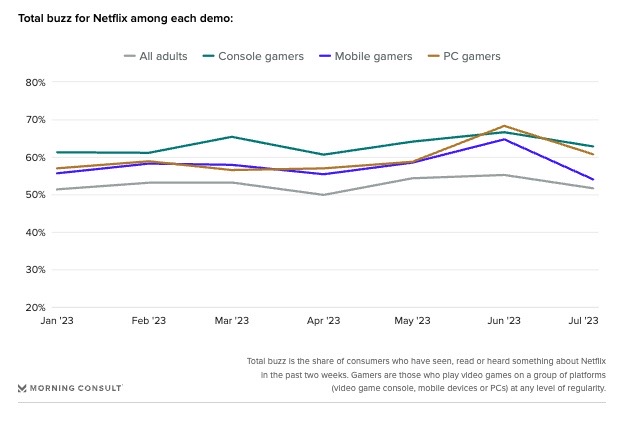 PC and console gamers are more likely to be familiar with Netflix than mobile gamers, though all gamers are more likely to be familiar than adults in general. (Morning Consult)