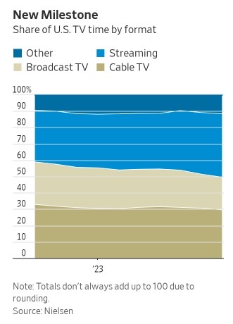 Streaming’s share of US viewing time grew to a new high in July, while television viewing fell below 50% for the first time. (WSJ)