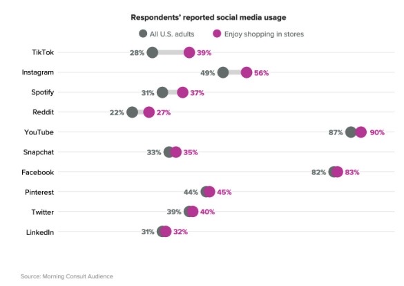 US adults who enjoy shopping in stores also tend to use TikTok, Instagram and Spotify at higher rates than the general population. (Morning Consult)