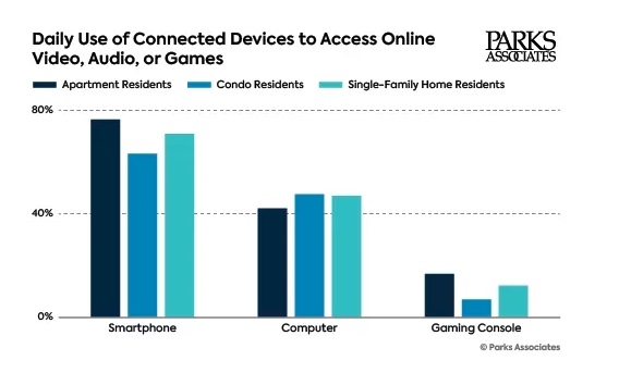 New Parks Associates research finds US apartment residents consume digital content at a higher rate than residents of single-family homes or condos, driven by higher use of smartphones and gaming consoles. (Parks Associates)