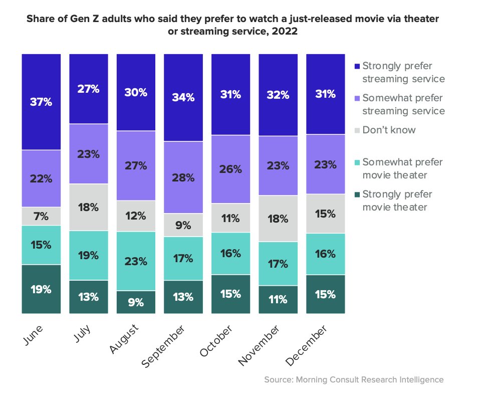 US Gen Z adults consistently prefer watching recently released movies on streamers rather than in theaters. However, during H2 2022 in every month except September, they were more likely than other generations to report going to the movies at least once a month. (Morning Consult)
