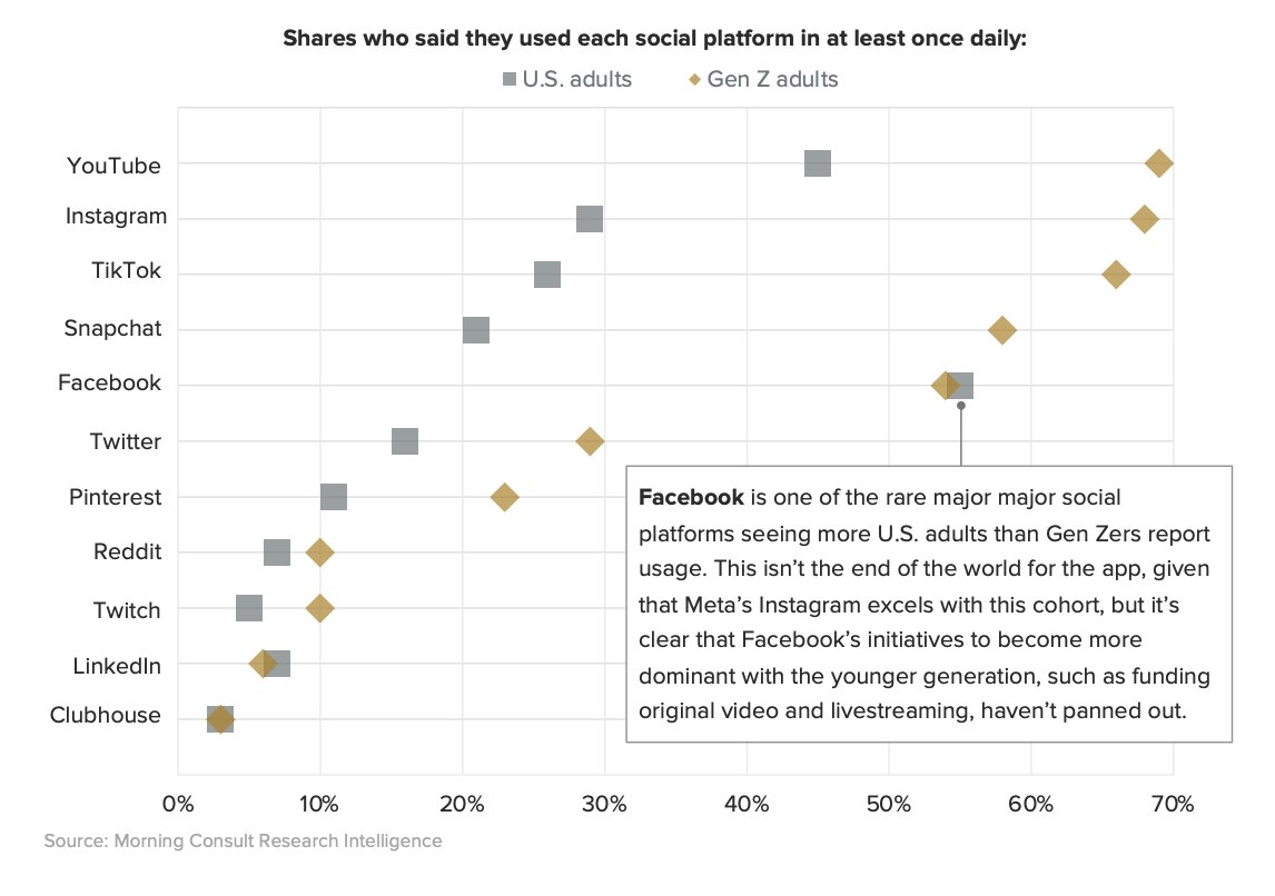 Only a handful of social media platforms have seen over 50% of US Gen Z adults using their apps daily. TikTok is one of the apps with the greatest difference between daily usage among Gen Z adults and adults overall. (Morning Consult)