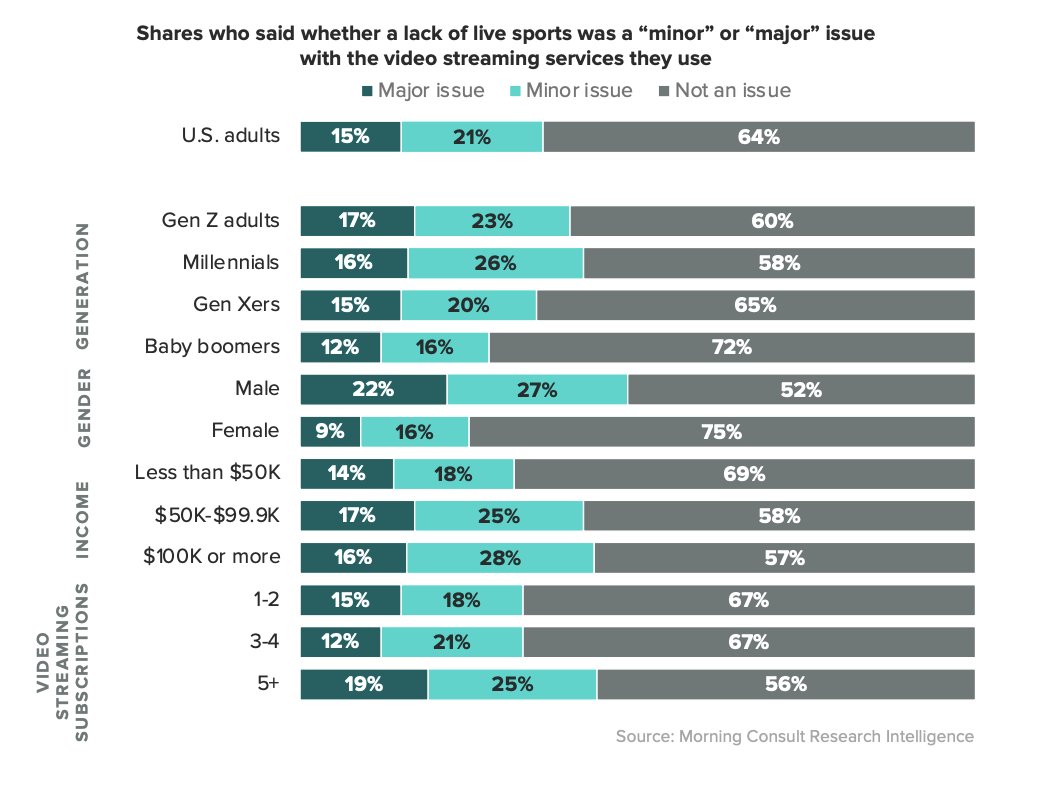 As of October, 36% of adult streaming users feel that a lack of live sports was a problem they had with the services they use. (Morning Consult)