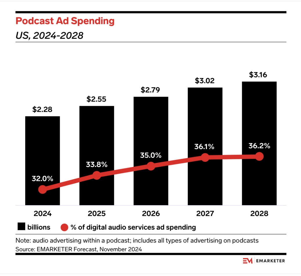 YouTube leads podcast listening platforms, with 31-33% of listeners preferring it over Spotify and Apple, largely due to it video capabilities and growing consumer preference for visual podcast content. (Emarketer)