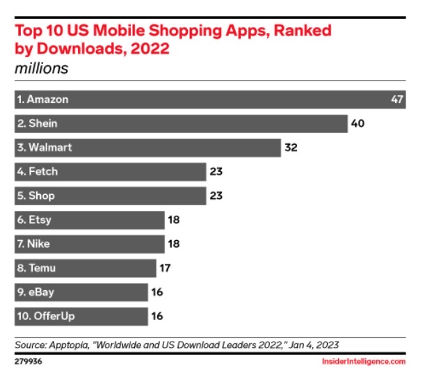 Amazon was the most downloaded mobile shopping app in the US in 2022. Closing in on Amazon was Shein at No. 2, followed by Walmart, Fetch, and Shopify’s Shop app. (Insider)