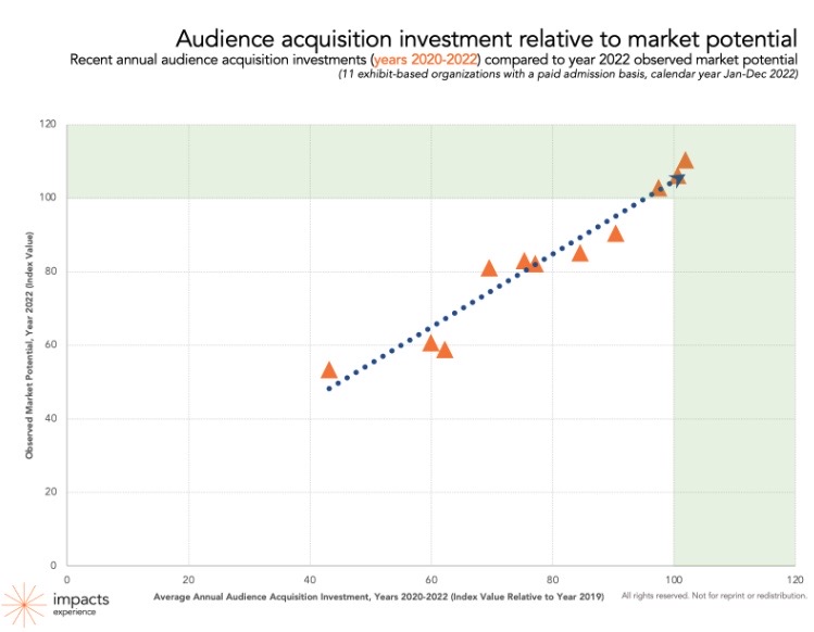 There is a clear correlation between sustained investment during the pandemic and maximizing market potential. Organizations that invested in audience acquisition at levels substantially similar or greater in year 2022 than they did in 2019 saw a significant payoff in their attendance. (Colleen Dilen)