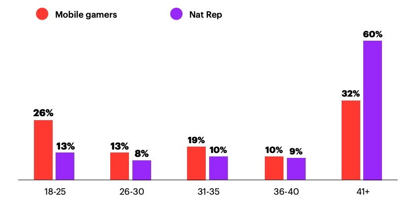 42% of US adults play mobile games for at least one hour per week. Those aged 41+ represent almost a third of mobile gamers. (YouGov)