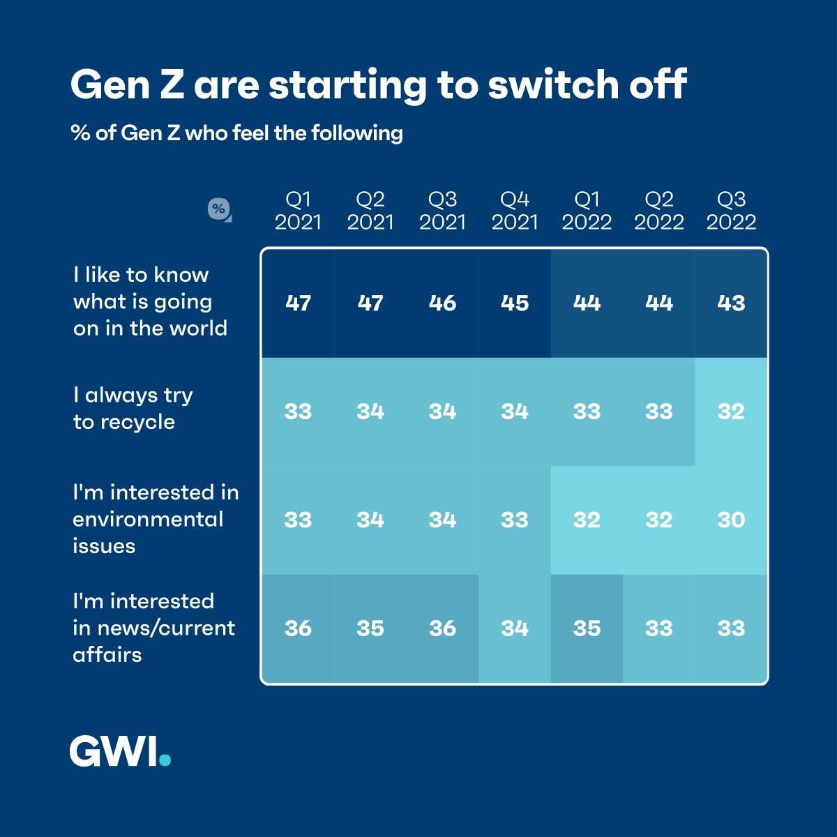 Gen Z appears to be switching off, with their interest in environmental issues ticking downward. Interest in news and current affairs and the number who like to know what’s going on in the world has also decreased by 7% in the past year. (GWI)