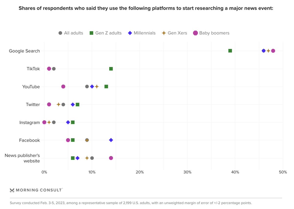 14% of US Gen Z adults say TikTok is where they start researching major news events, while 13% leverage YouTube. (Morning Consult)