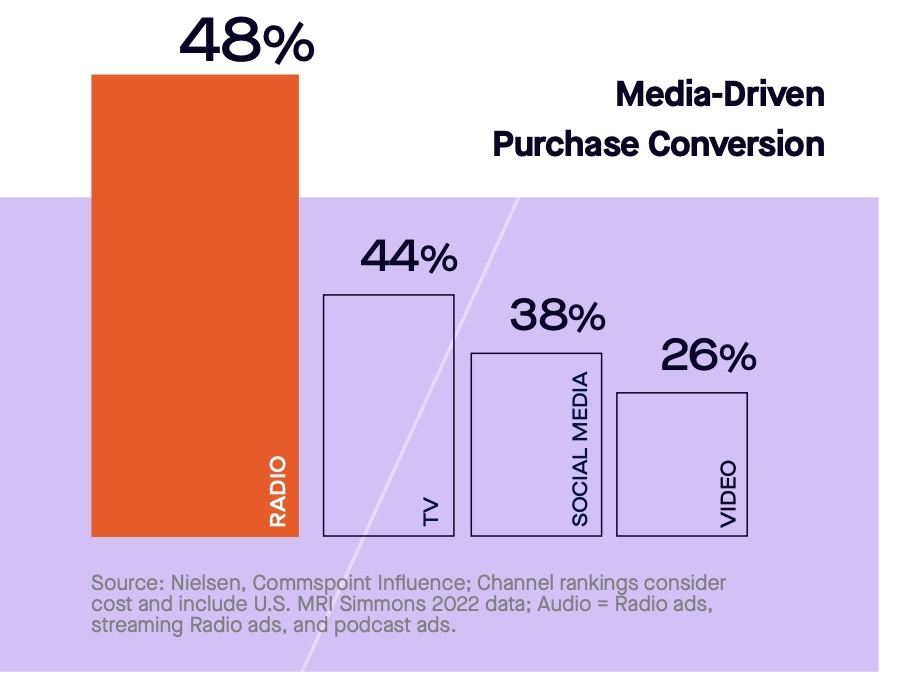 When cost is factored in, radio drives 48% of US adults to purchase, ahead of TV (44%), social media (38%), and video (26%). (Audacy)