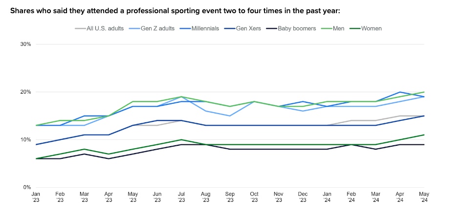 From January 2023 to May 2024, the number of US adults that had gone to two to four professional sporting events in the past 12 months increased from 9% to 15%. (Morning Consult)