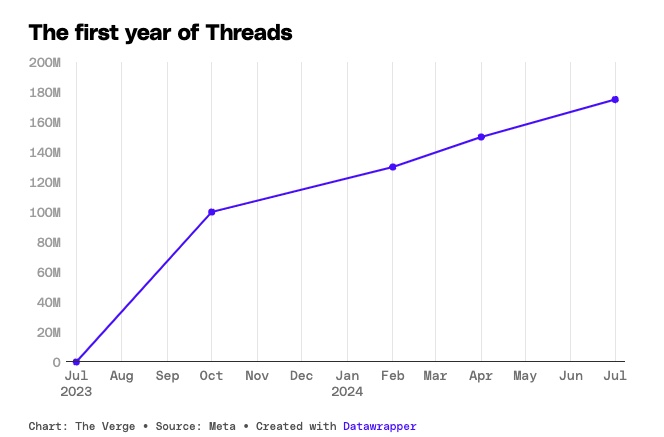 Threads hit 175M users a year since its launch, growing at a steady clip. (The Verge)