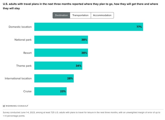 33% of Americans plan on traveling for leisure this summer, and domestic travel will be most popular. (Morning Consult)