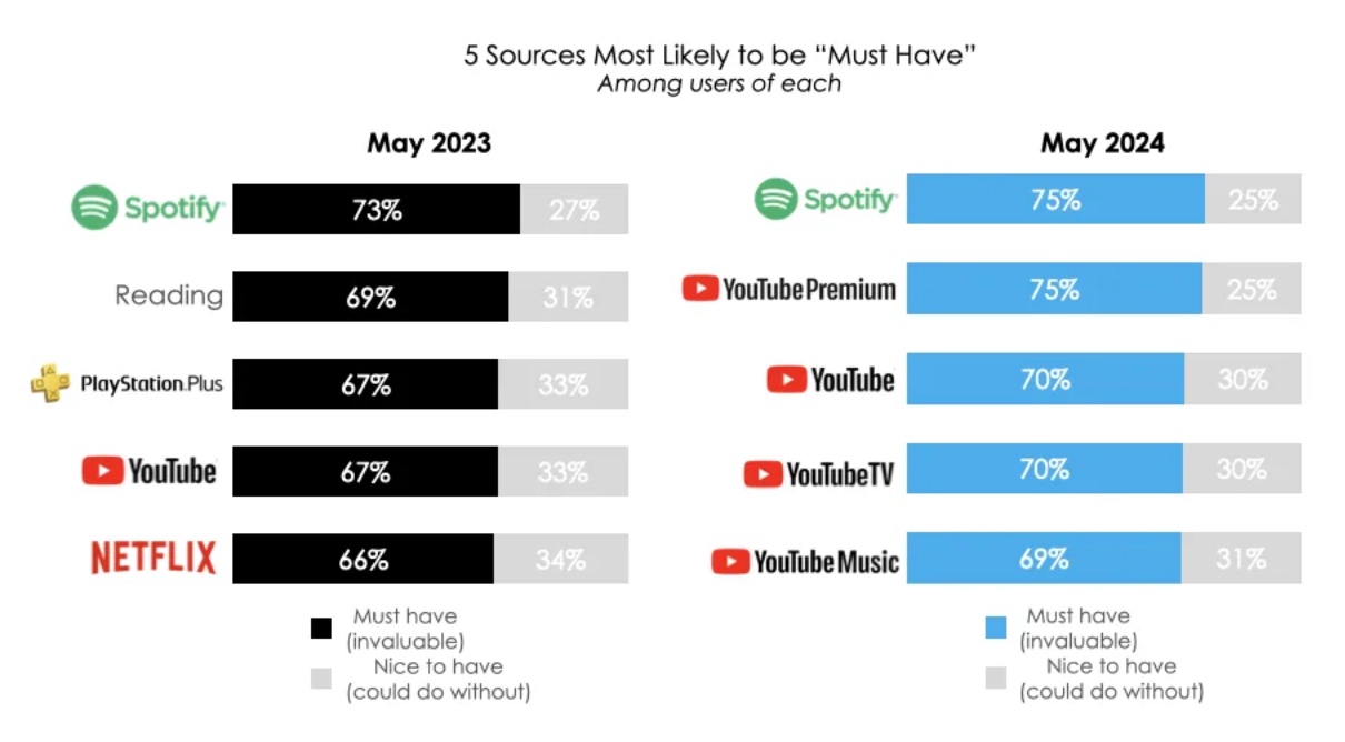 YouTube Premium is ranked as a must-have service by 75% of US users, a fraction of a percent behind Spotify. (Yahoo)