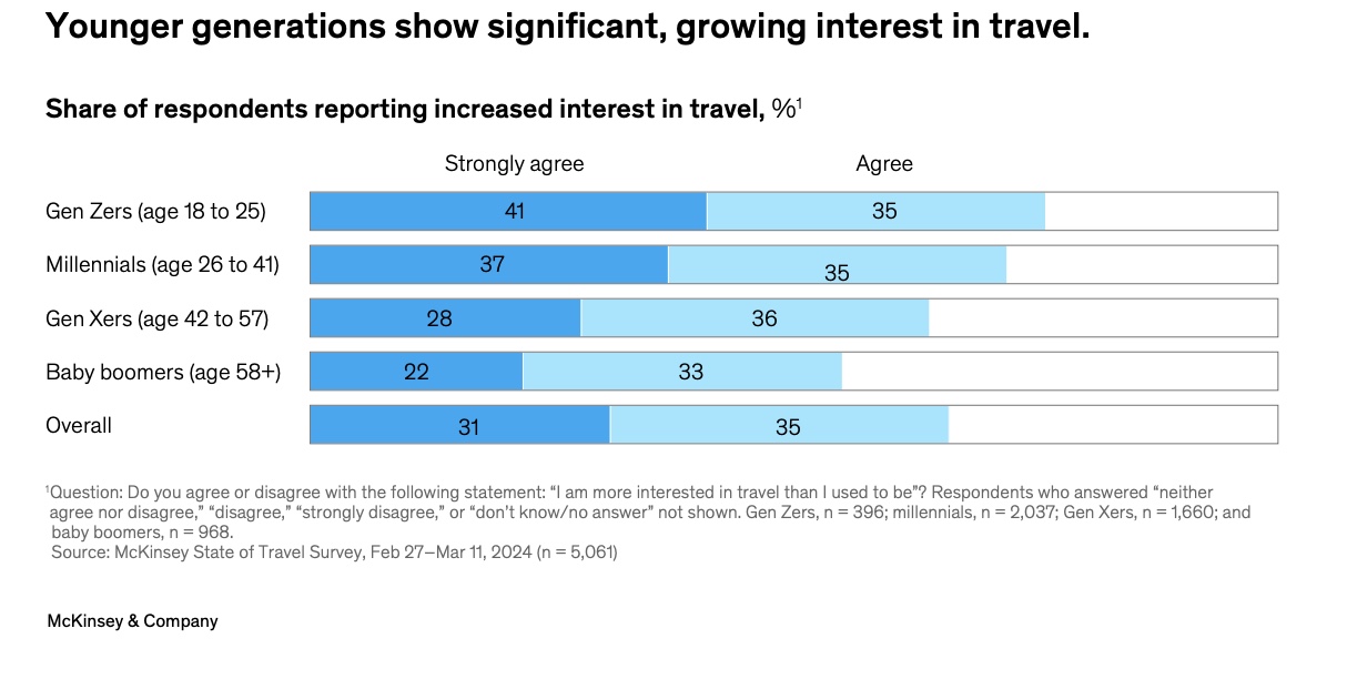 Two-thirds of travelers globally, especially younger travelers, are more interested in travel now than they were before the COVID-19 pandemic. (McKinsey)
