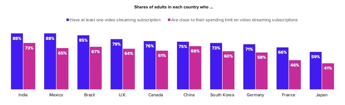 Consumers in Japan, South Korea, France and Germany are the least close to maxing out on spending money for subscription services. (Morning Consult)