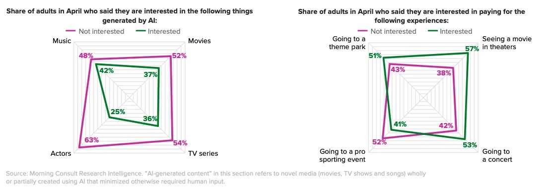 37% of US adults are interested in AI-generated movies, while 57% are interested in paying to see a movie in theaters. (Morning Consult)