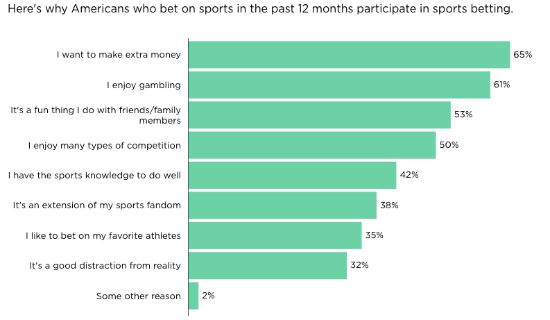 One in 5 Americans (20%) placed a sports bet in the past 12 months, up from 12% a year ago, and many do so simply because they enjoy it. (Nerdwallet)