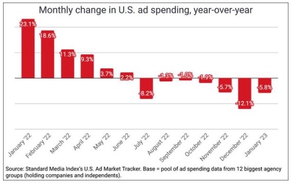 The US advertising marketplace fell for the seventh consecutive month in January, declining 5.8% from January 2022. (Media Post)