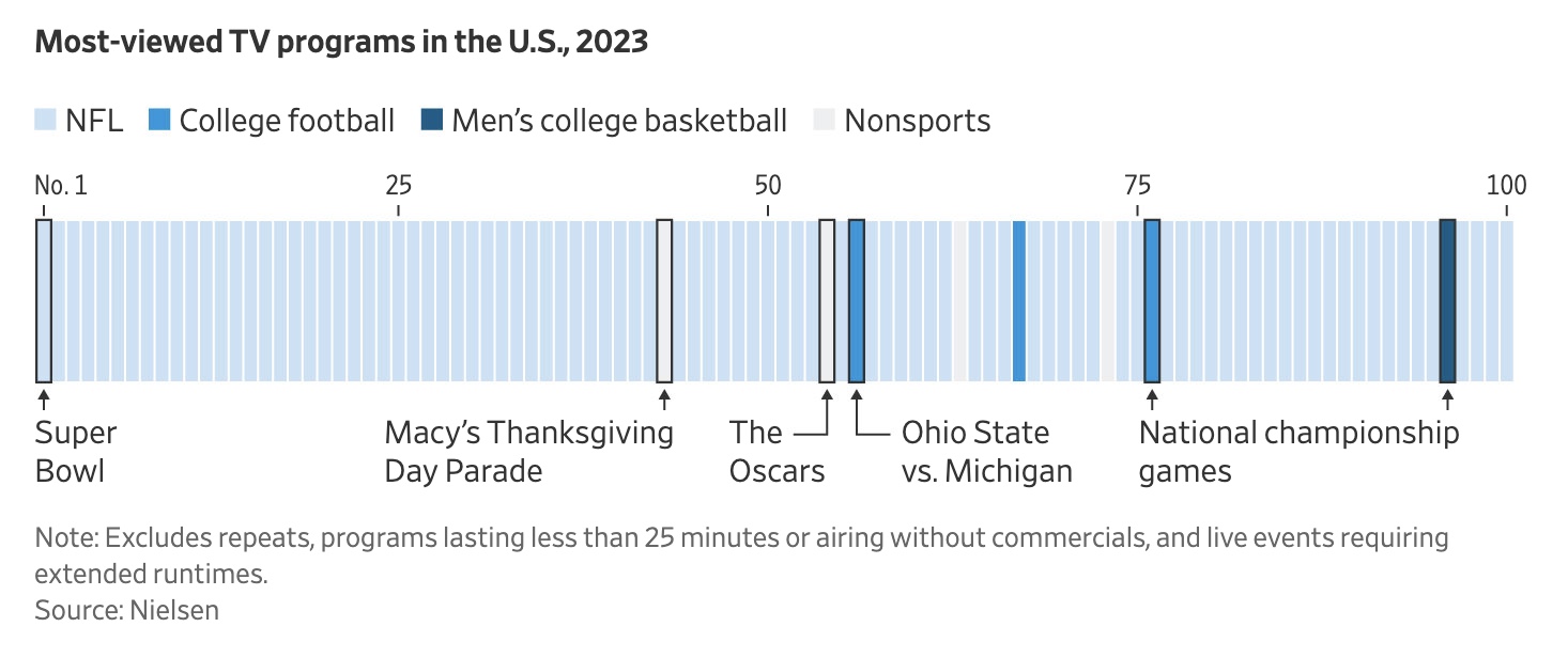 Of the 100 most-watched broadcasts in the US last year, sports accounted for a whopping 96. (WSJ)