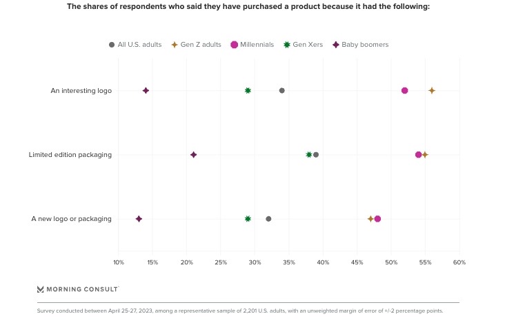 A majority of US Gen Z adults (56%) and millennials (52%) have bought a product because it had an interesting logo while 34% of all US adults have. (Morning Consult)