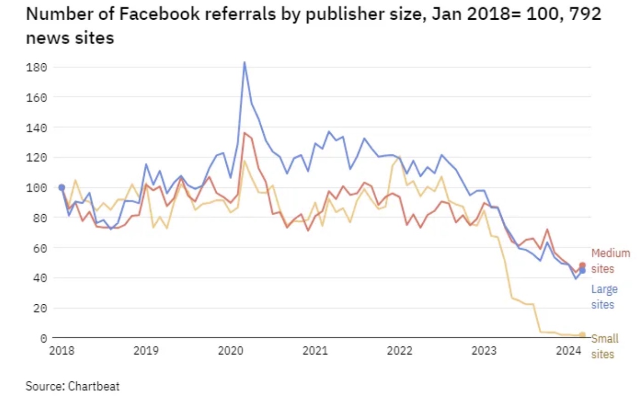 Facebook referral traffic to publisher websites has declined by 50% over the past year. (Social Media Today)
