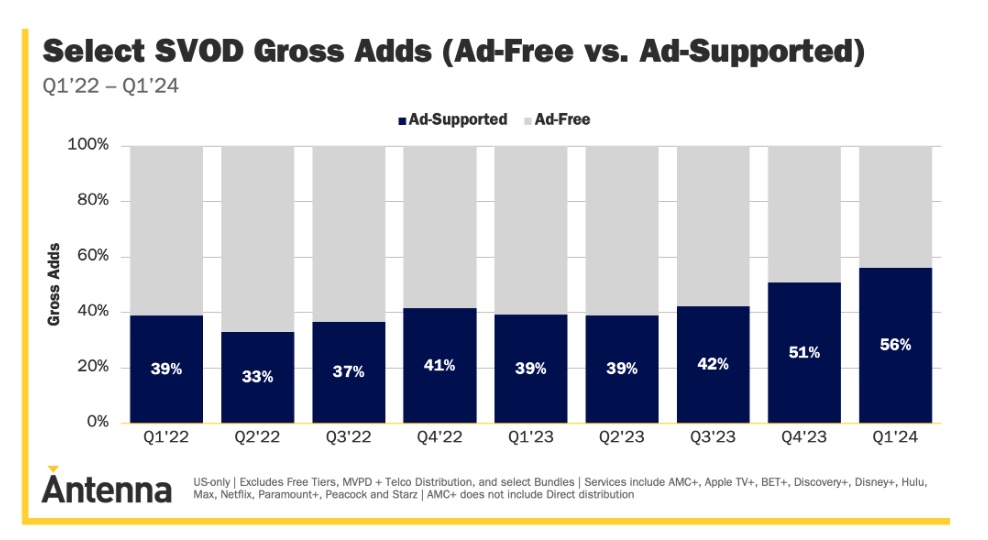 In the US, 56% of new subscribers to streaming platforms chose ad-supported plans over ad-free subscriptions in Q1. (Antenna)
