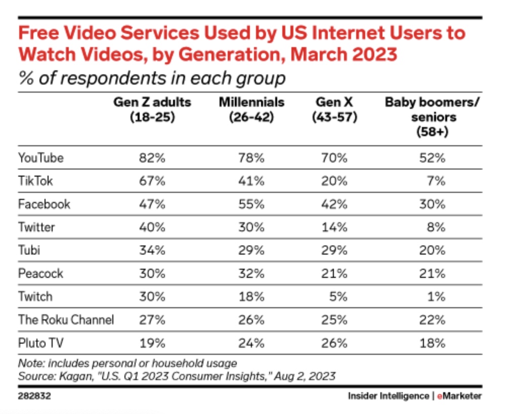 YouTube is the most popular free video service across all generations in the US as of Q1 2023. (Insider)