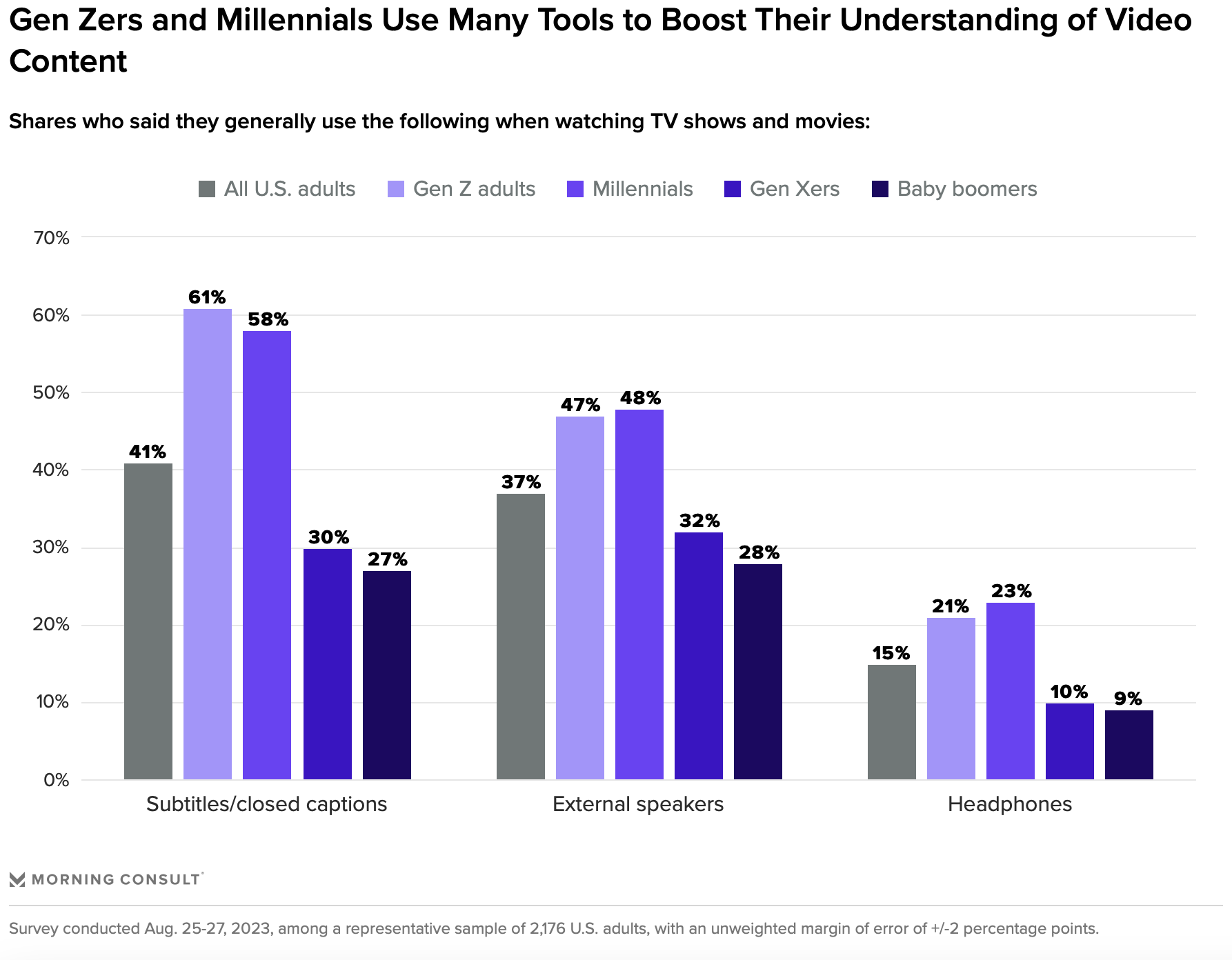US Gez Z and millennials adults are using subtitles at much higher rates than baby boomers and Gen Xers due to factors like the increasing amount of non-English language originals. (Morning Consult)