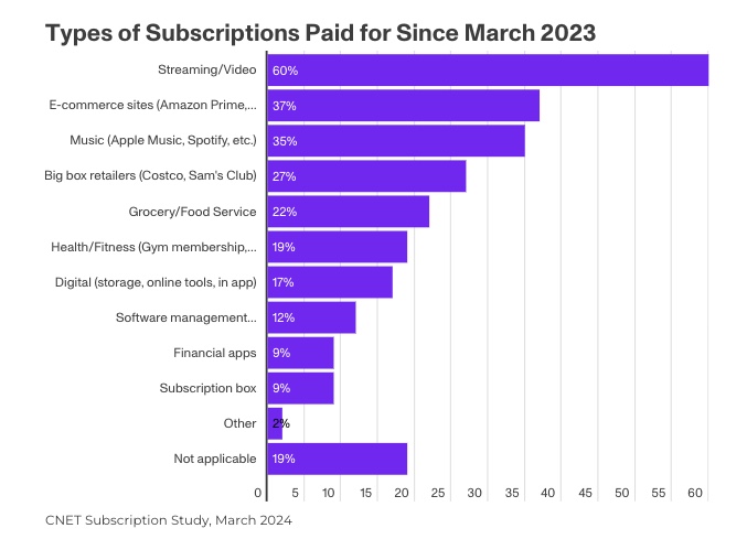 US adults spend an average of $91 on subscription services each month, with streaming/video being the highest spend category. (Cnet)
