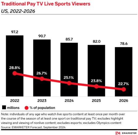 The number of US live sports viewers tuning in through traditional pay TV services will continue its decline, averaging a rate of 4.4% YoY over the next five years. (eMarketer)