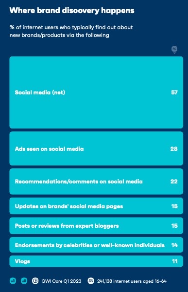 The majority of internet users globally typically discover brands via social media, whether it be organically or via ads. (GWI)