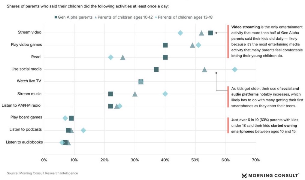 Video streaming is the only entertainment activity that more than half of Gen Alpha parents say their kids do daily. (Morning Consult)