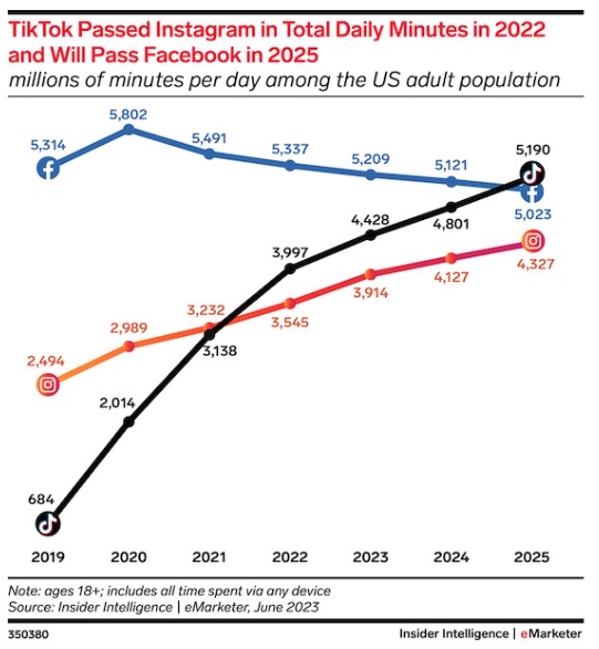 TikTok will beat Facebook in time spent in 2025, with US adults spending over 5.19B total minutes per day on the platform. (Insider)