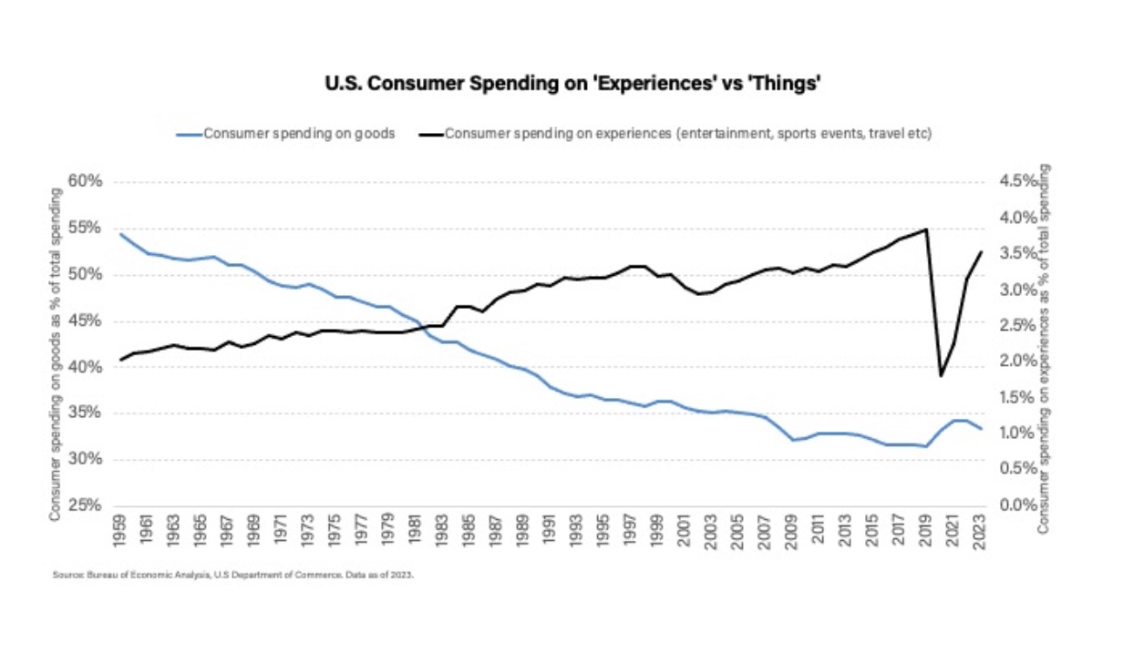 US consumers are spending more on experiences such as entertainment, adventure travel, and personalized excursions. (Skift)