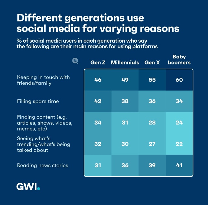 While older generations use social media for keeping in touch with friends and family, younger generations use it to fill spare time. (GWI)