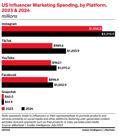 Instagram leads in influencer marketing spend, even as marketers spread budgets across social channels. (Insider)